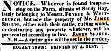 James Sharpe was quite a common name and in the early 19th Century, several were living in Australia, some of them convicts. Our James Sharpe seemed to appear out of nowhere and bought the farm at Sandy Bay in 1824, which made me suspicious, but in newspaper ads he mentioned his respectability, so it seemed unlikely he was a convict, especially in view of the following case reported in 'The Colonial Times' of Feb 11, 1834 John Acton stood charged with stealing a handkerchief, the property of Mr. James Sharp, of Sandy Bay. Verdict-Guilty. Sentence-Imprisonment and hard labor for six months. . It turns out James Sharp was a farmer of 57 (as respectable as you can be with a wife 32 years younger) when he arrived in Tasmania with his wife Hannah, 25, and their 2 children, Jane Sharpe 2 years and George Henry Sharpe, a baby, aboard the Thalia on April 27, 1823. He had a reference from Mr Chester of London in support of his application for 500 acres of land, which was granted. "In his official application in Hobart Town, James stated that he had £1,300 in cash and about £200 in property. He was given a grant of 1,000 acres in the county of Forbes." James soon asked to take up land at Sandy Bay instead, and permission was given. A three roomed cottage was built on the property and the third child, Thomas, was born in Feb, 1825. Sharp was an experienced farmer and purchased more land as it became available. From the Hobart Town Courier, front page, 22 November 1833, under the column heading, SURVEY OFFICE, November 15, 1833: