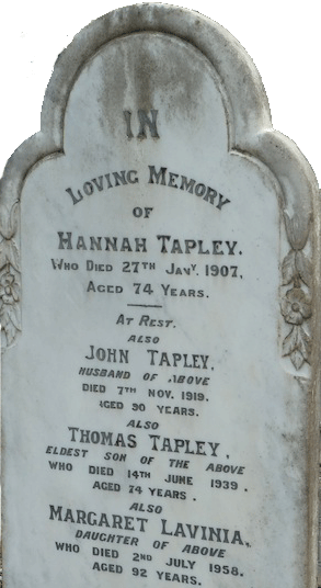 2-8-2019: In a fascinating twist to the Tapley story, Ray Wright of Perth contacted me concerning his great grandmother, Mabel Kate Tapley, born 1883 in Adelaide. Her birth certificate shows her name as Kate Mabel Tapley, born to parents Kate (Katherine Knill - nee Hancorne) and John Tapley. Kate was fostered out from very young...SA State Records on destitute/fostered children confirmed the parent and foster parent details and regular foster home inspections. It appears that Kate was fostered and well cared for by Ernest and Harriet Greeneklee about whom there is a good family write up on the internet titled "The 3 Brothers" The mother of Kate was Katherine (Kate) Hancorne, incorrectly recorded as Hancarne on the birth certificate. She married George Knill about a year after Kate's birth. At the time, John Tapley was still married to Hannah when he fathered his 10th child with Katherine. Kate Mabel Tapley was born 29-4-1883 in North Adelaide, SA. Her mother was Katherine or Kay Hancorne, born Sept 1862 in Middlesex, aged 21, and her father was John Tapley of Port Augusta, aged 53 years. The baby appears to have had no contact with her mother or the Tapleys. Hannah Tapley died at Myponga on 27-7-1907 pre-deceasing John who died on 7-11-1919. A short newspaper obituary states that she had been an invalid for 30 years. They are both buried at the Myponga Uniting Church, 47 Main South Rd, Myponga, South Australia, south of Adelaide. With them in the grave are Thomas Tapley, their eldest son and fifth child who died 14-6-1939, and Margaret Lavinia Tapley, their 5th daughter and sixth child.